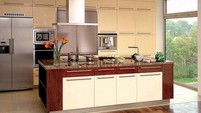 - Идеально, чтобы шкафчики, рабочая поверхность были установлены в середине кухни, тогда повар может занять любую удобную позицию.